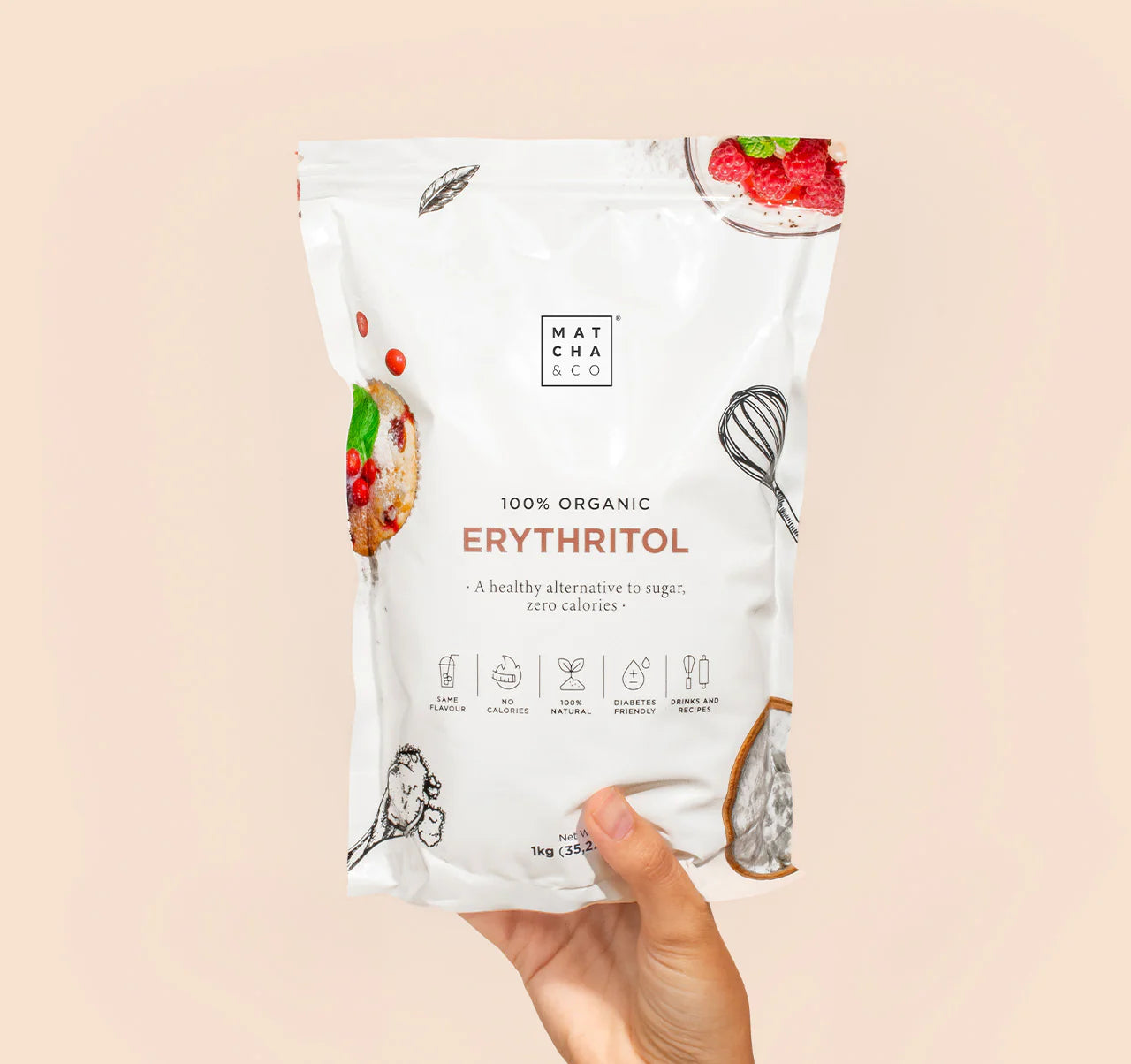 Erythritol is a natural sweetener found in some fruits. It has a sweet, pleasant taste, but unlike sugar, it doesn't affect blood sugar levels and has a very low calorie count.